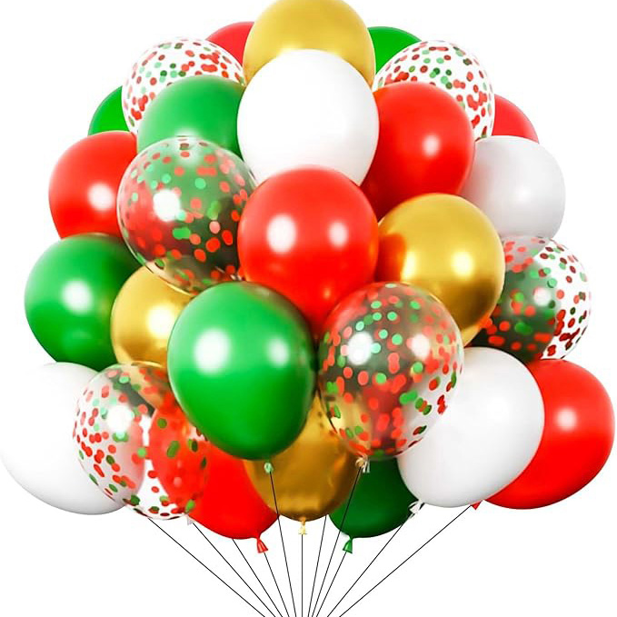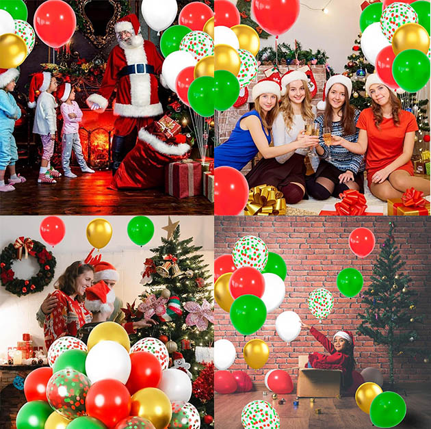 Конфетти: прозрачный мяч встроен с красным, зеленым и золотым конфетти. После инфляции это похоже на снежинки, давая динамичную атмосферу рождественскому воздушному шару конфетти и превращение статической композиции в «захватывающую снежную сцену».