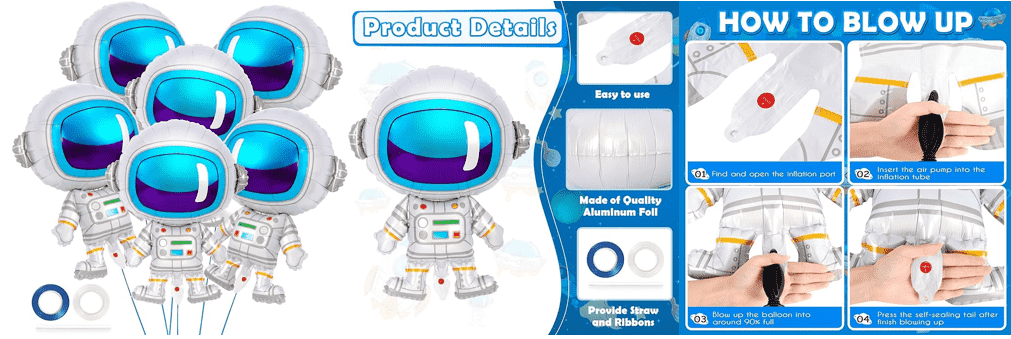 Есть распространенная форма тела космонавтов, показывающая изображение космонавтов в скафандре, некоторые модели с основой, надувные могут стоять. Существуют воздушные шары разных размеров, например 18 дюймов, 24 дюйма, 28 дюймов и т. д., а также некоторые более крупные воздушные шары, например, фольгированные шары с космонавтами высотой 65 см. В основном он используется для вечеринок по случаю дня рождения в космической тематике, вечеринок по случаю рождения ребенка, украшения детской комнаты и других мероприятий, которые могут добавить мероприятию радостную космическую атмосферу.