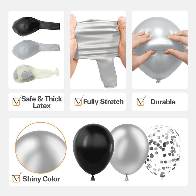 В модных черных и серебряных гирляндах из воздушных шаров часто используются латексные шары. Они имеют разные размеры. Цвета — матовый черный и серебристый металлик. У них четкие слои и приятный соответствующий блеск. Весь вид полный и трехмерный. Латекс хорошего качества делает воздушные шары эластичными и гладкими. Их нелегко лопнуть. Даже если их положить на долгое время, они останутся целыми и круглыми. Они не пропускают воздух и не теряют цвет. В некоторых наборах также есть фольгированные шары. Они добавляют светоотражающий вид. Они делают все украшение более блестящим и приятным на ощупь. Они демонстрируют причудливый современный стиль.