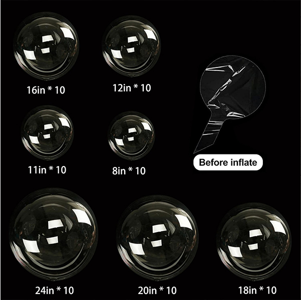 Прозрачные воздушные шары Bobo доступны в различных размерах, перечисленных здесь. Различные размеры соответствуют различным моделям и их общим раздутым размерам. Вы можете настроить свой размер соответственно.