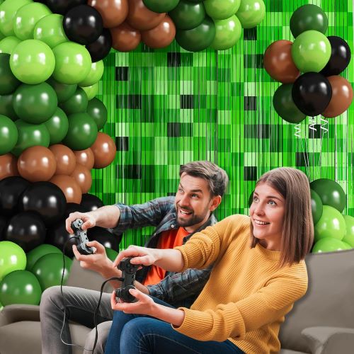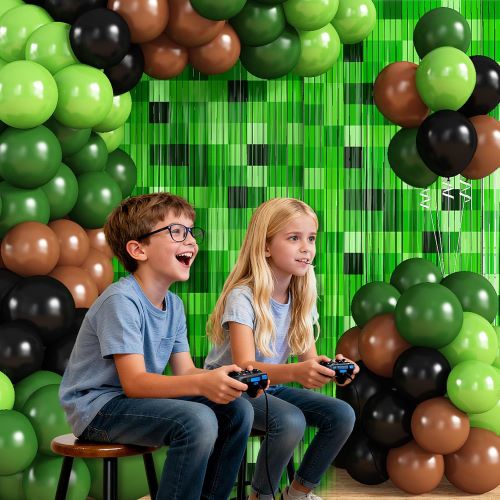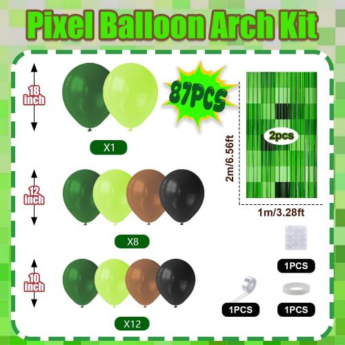 Этот прочный комплект арки из воздушных шаров Minecraft, вдохновленный видеоиграми Minecraft, сочетает в себе различные оттенки зеленых пиксельных шаров с фонами для вечеринок в стиле Minecraft, создавая игривый многослойный образ, передающий очарование классических приключенческих игр.