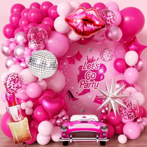 В комплекты входят 5-дюймовые и 12-дюймовые матово-розовые латексные шары, 5-дюймовые и 12-дюймовые жемчужно-розовые латексные шары, 5-дюймовые и 12-дюймовые металлические розовые латексные шары, 5-дюймовые и 12-дюймовые белые латексные шары, 12-дюймовые розовые латексные шары с конфетти, 18-дюймовые розовые и белые сердечные фольгированные шары, 18-дюймовые фольгированные шары со звездами, розовые фольгированные шары, розовые фольгированные шары Happy Birthday, украшения в виде бабочек и аксессуары, такие как: приклейте точки, полоску шариков и ленту.