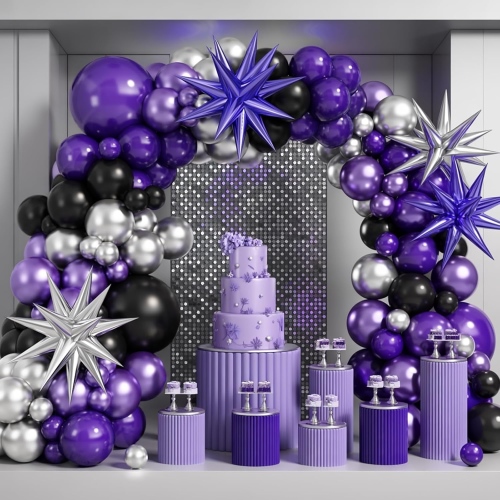Высококачественные наборы гирлянд из фиолетовых и черных воздушных шаров позволяют комбинировать черные и фиолетовые воздушные шары. Их можно комбинировать черные и фиолетовые воздушные шары с серебряными воздушными шарами или воздушными шарами из серебряной фольги, чтобы подчеркнуть комплекты арок гирлянды из воздушных шаров. Он идеально подходит для выпускных вечеров, церемоний для взрослых и других знаменательных торжеств, воплощая в себе ощущение ритуала прощания с молодостью и вступления во взрослую жизнь. Их также можно комбинировать черные и фиолетовые воздушные шары с золотыми шарами или шарами из золотой фольги. Он идеально подходит для таких случаев, как корпоративные юбилеи и открытия новых магазинов, поскольку он излучает профессионализм и изысканность, одновременно создавая высококачественный и авторитетный имидж бренда. Их также можно сочетать с синими воздушными шарами, чтобы создать футуристический образ. Эти наборы воздушных шаров особенно хорошо подходят для электронных спортивных, модных и научно-фантастических вечеринок, предлагая поразительный визуальный эффект.