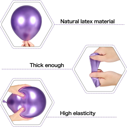 Наши фиолетовые и черные воздушные шары изготовлены из натурального латекса. Надутые воздушные шары имеют полную и пухлую форму, и их нелегко лопнуть. Они отличаются яркими и насыщенными цветами. Наши воздушные шары прошли такие испытания, как EN71, CPC и CE. Они безопасны и нетоксичны, что делает их пригодными для игр детей. Их можно продавать в разных странах.