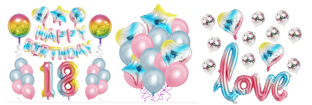 Цветовой аспект: воздушный шар из фольги с радужным номером с использованием градиентного расцвета, цветной строчки, радужных полос и других процессов, демонстрирующих богатое разнообразие цветовых эффектов. Некоторые продукты основаны на семи основных цветах: красном, оранжевом, желтом, зеленом, синем, индиго и фиолетовом. Благодаря технологии постепенного изменения естественного перехода они создают прозрачную текстуру, похожую на радугу после дождя. В некоторых продуктах используются коллизии цветов с высокой насыщенностью, такие как сращивание розового и синего, желтое и зеленое эхо, что создает сильный визуальный эффект и освещает атмосферу вечеринки. Эти цветовые решения соответствуют психологическим ассоциациям публики с красотой и удачей, символизируемыми радугой, а также могут быть адаптированы к стилям вечеринок различной тематики.