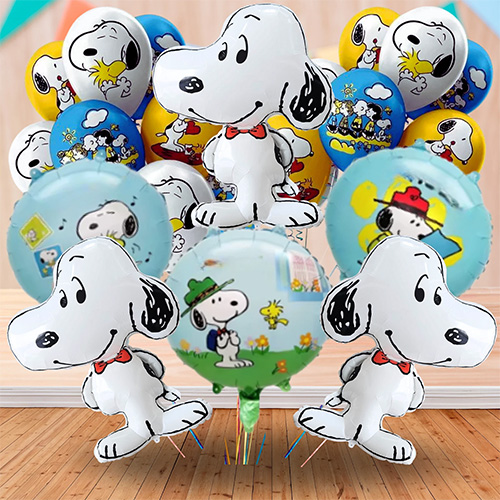 В комплект гирлянды из воздушных шаров Snoopy входят различные элементы из фольгированных шаров Snoopy, которые делают общий вид ярче. Их легко комбинировать и они приносят радость детям.