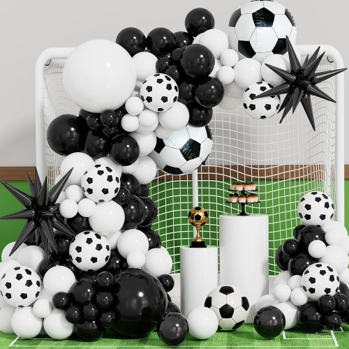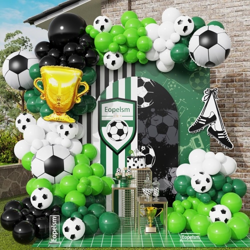 В комплекты входит 12-дюймовый темно-зеленыйлатексные шары, 12-дюймовые черные латексные шары, 12-дюймовые латексные шары с зеленым конфетти, 12-дюймовые латексные шары с металлическим серебром, 12-дюймовые латексные шары с футбольным принтом, футбольные фольгированные шары, фольгированные шары со звездами, бумажный баннер с днем рождения, бумажные цветы и аксессуары, такие как клеевая точка, лента и полоска воздушных шаров.
