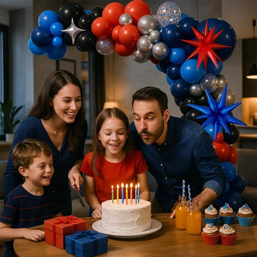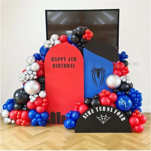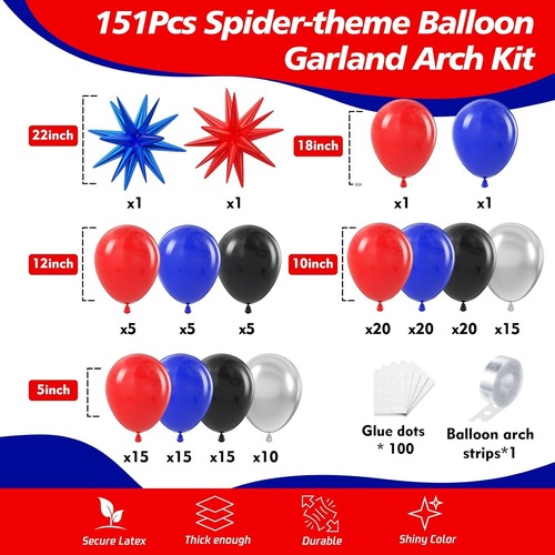 Основные цвета набора воздушных шаров – синий, красный и черный. Отличительные три цвета заставят вас представить крутую фигуру Человека-паука из фильма. Латексные шары в этом наборе включают матовый красный шар, матовый синий шар, матовый черный шар и серебристый металлический шар. Фольгированный шар в этом наборе представляет собой фольгированный шар со звездой взрыва, цвет синий и красный.