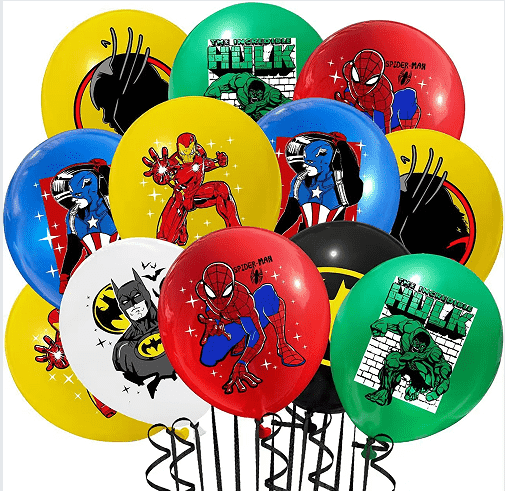 Мы обеспечиваем печать на латексных шарах размером 5, 10, 12, 18 и 36 дюймов, используя экологически чистые чернила для печати различных тематических рисунков Человека-паука.