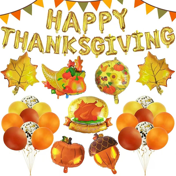 Латексные воздушные шары в День Благодарения имеют теплые осенние цвета и материал хорошего качества латекса. Они являются одним из классических украшений на День Благодарения. Цвета часто являются оранжевыми, коричневыми, желтыми и бордовыми. Эти теплые цвета совпадают с тыквами, кленовыми листьями и индеек. Они могут легко показать чувство урожая и воссоединения семьи.
